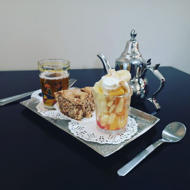Autour d'un tagine, une pastilla, un couscous..., pour finir avec une douceur maison accompagnée d'un délicieux thé à la menthe servi à la marocaine.